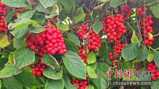秋日里,安圖縣亮兵鎮(zhèn)會(huì)財(cái)村色彩斑斕,一株株藤蔓沿著水泥樁蜿蜒攀升,一排排連成一片,遠(yuǎn)遠(yuǎn)望去,如同為田野織就了一層綠綢;綴滿(mǎn)其間的五味子,則是這綢面上最亮眼的“紅寶石”。