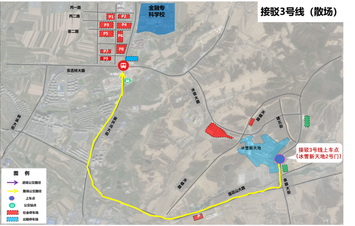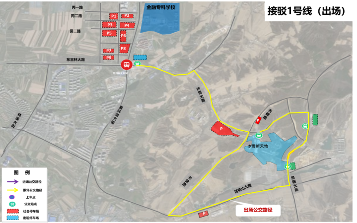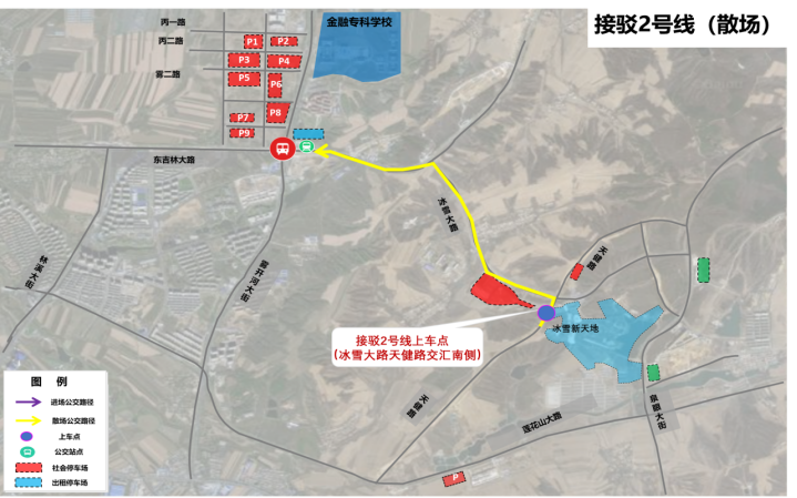 1號(hào)門:出園游客在冰雪新天地1號(hào)門(天健路公交車臨時(shí)站點(diǎn))乘坐接駁2號(hào)線公交車返回地鐵霧開河大街站B口,換乘停車場擺渡車,返回臨時(shí)停車場。(如下二圖)