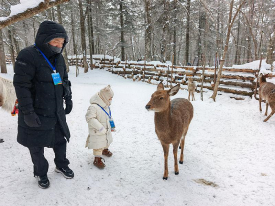 行至景區(qū)中心處的“粉雪部落”,濃郁的東北風(fēng)情撲面而來!爸侨⊥⑸健敝黝}場景成了最熱鬧的打卡點(diǎn),歡聲笑語不斷。鹿園里,孩子們輕輕撫摸馴鹿、喂食苔蘚,體驗(yàn)著與森林精靈親近的樂趣!霸谀戏綇臎]見過真正的馴鹿,這種體驗(yàn)太難得了”,來自云南的段先生一邊錄制視頻,一邊準(zhǔn)備向家人“炫耀”這份難得的美好。