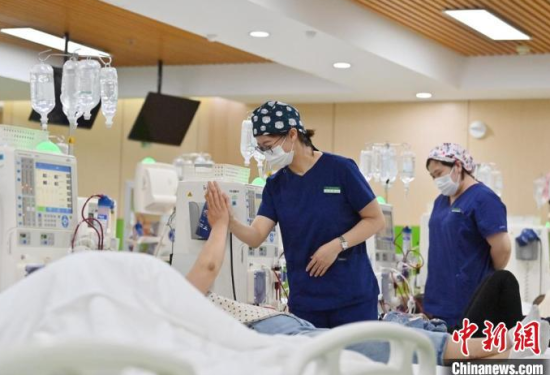 5月9日,長春中醫(yī)藥大學(xué)附屬醫(yī)院腎病科門診透析室內(nèi),護(hù)士在為患者加油打氣!埇 攝