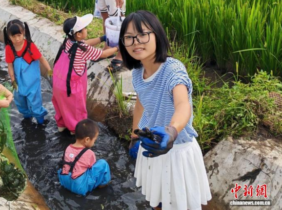 8月11日,2025年吉林省臺(tái)聯(lián)第五屆兩岸婚姻家庭親子夏令營(yíng)走進(jìn)吉林市,營(yíng)員們?cè)诘咎矬w驗(yàn)抓螃蟹!↑S子珊 攝