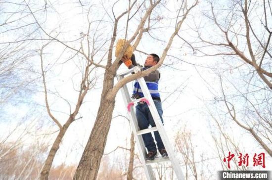 11月23日,趁著雪后天晴,吉林長(zhǎng)春友誼公園的工作人員忙著維護(hù)樹上的草編鳥巢,并投放了鳥糧。該公園生態(tài)環(huán)境好、野生鳥類多,園方已經(jīng)連續(xù)三年在園區(qū)設(shè)置百余個(gè)草編鳥巢助鳥類安全過冬。