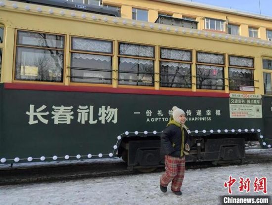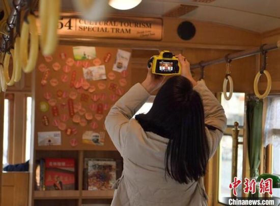 1月8日,吉林長春,一輛54路有軌電車文旅專列吸引游客打卡拍照。該專列外形復(fù)古,車廂布置獨具特色,游客預(yù)約后可購票乘車體驗車內(nèi)及市區(qū)沿線的人文風(fēng)情。