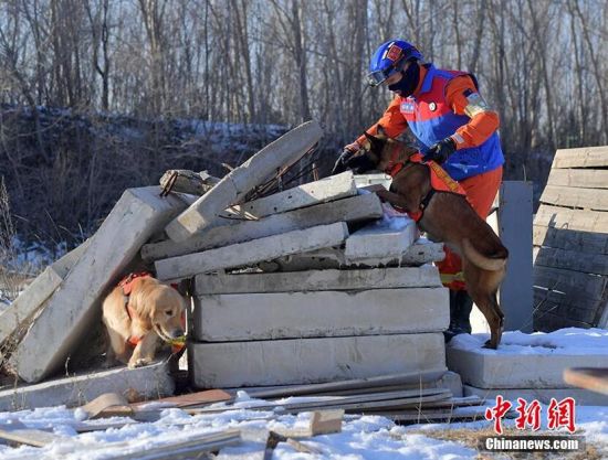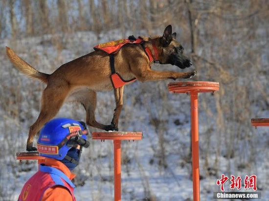1月18日,在吉林省森林消防總隊特勤大隊訓練場內,搜救犬正在訓練。為提高搜救犬在嚴寒環(huán)境的適應和實戰(zhàn)能力,吉林省森林消防總隊特勤大隊搜救犬分隊近期通過障礙攀登、繞腿訓練、廢墟搜索訓練等科目,對搜救犬進行冬訓,進一步提升訓導員與搜救犬的默契度和技戰(zhàn)素養(yǎng)。