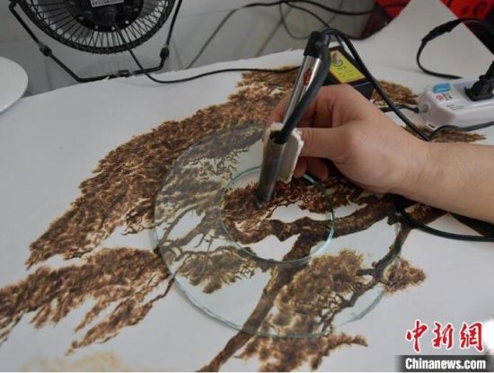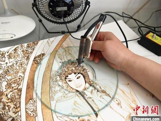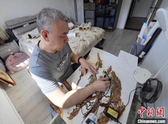 4月3日,吉林長(zhǎng)春,56歲的長(zhǎng)春市民王巖在工作室進(jìn)行烙畫創(chuàng)作。自幼熱愛(ài)繪畫的王巖,在機(jī)緣巧合下接觸到烙畫技藝,從此便悉心鉆研。烙畫又稱火筆畫,是指用火燒烙鐵在物體上熨出烙痕作畫的一項(xiàng)技藝。