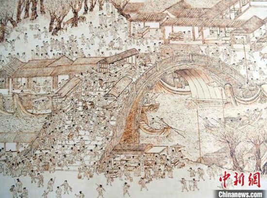 王巖正在查看作品中的細(xì)節(jié)。王巖正在創(chuàng)作烙畫作品。王巖正在創(chuàng)作烙畫作品。王巖正在創(chuàng)作烙畫作品。王巖用烙畫技術(shù)臨摹的明代清明上河圖。