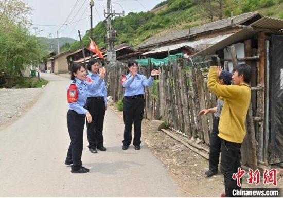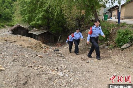 “女子警務(wù)團”來到村里走訪。崔藝琳(右一)說,轄區(qū)里很多村子道路難行,但從沒阻止她們前行的腳步!埇 攝