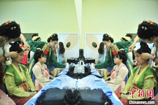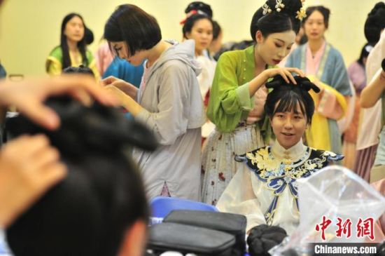 7月9日,吉林四平,2024年全國(guó)臺(tái)聯(lián)第二十一屆臺(tái)胞青年千人夏令營(yíng)吉林分營(yíng)的30余位臺(tái)胞青年參加傳統(tǒng)文化講座,學(xué)習(xí)漢服禮儀、漢服種類(lèi)劃分等知識(shí),并第一次穿上漢服進(jìn)行體驗(yàn),感受傳統(tǒng)文化之美。圖為臺(tái)胞青年在進(jìn)行漢服妝造。高龍安 攝
