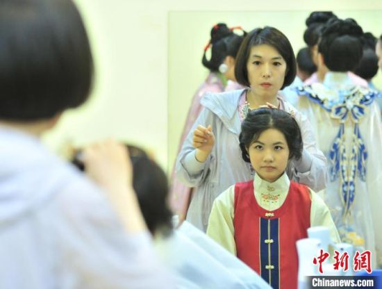 7月9日,吉林四平,2024年全國(guó)臺(tái)聯(lián)第二十一屆臺(tái)胞青年千人夏令營(yíng)吉林分營(yíng)的30余位臺(tái)胞青年參加傳統(tǒng)文化講座,學(xué)習(xí)漢服禮儀、漢服種類(lèi)劃分等知識(shí),并第一次穿上漢服進(jìn)行體驗(yàn),感受傳統(tǒng)文化之美。圖為臺(tái)胞青年在進(jìn)行漢服妝造。