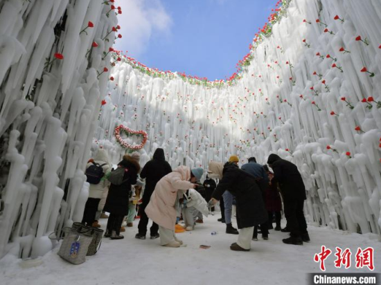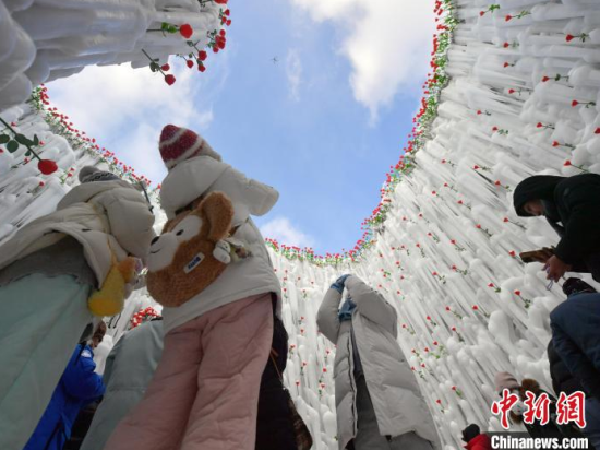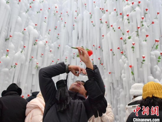 12月26日,吉林長白山,游客在冰洞內打卡。進入雪季,長白山推出“愛心冰封玫瑰”吸引大量游客打卡拍照,冰洞內被玫瑰道具環(huán)繞,洞頂呈心形,充滿浪漫氣息。