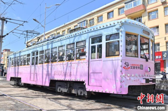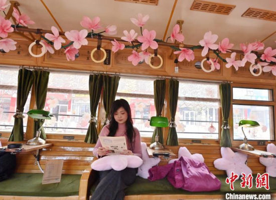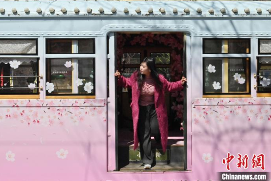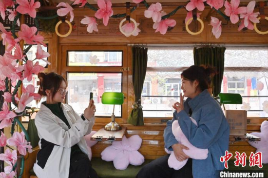 4月18日,吉林長春,游客在54路文旅春日限定專列上拍照留念。該專列車廂內外融入了桃花的設計元素,營造出濃郁的春意,吸引了眾多游客前來打卡。中新社記者 張瑤 攝