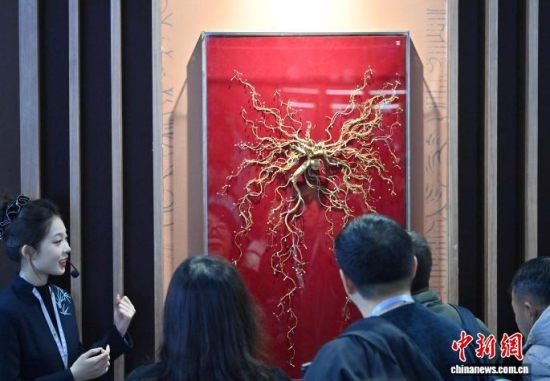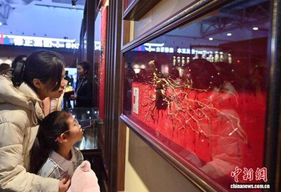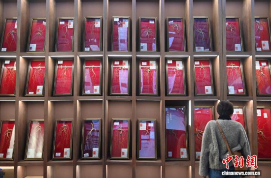 12月7日,吉林長春,參觀者在參觀人參。當(dāng)日,2025長春國際醫(yī)藥健康產(chǎn)業(yè)博覽會開幕,具有當(dāng)?shù)靥厣那暌吧絽ⅰ⑷藚?biāo)本在人參展區(qū)展出,吸引了參觀者的目光。中新社記者 張瑤 攝